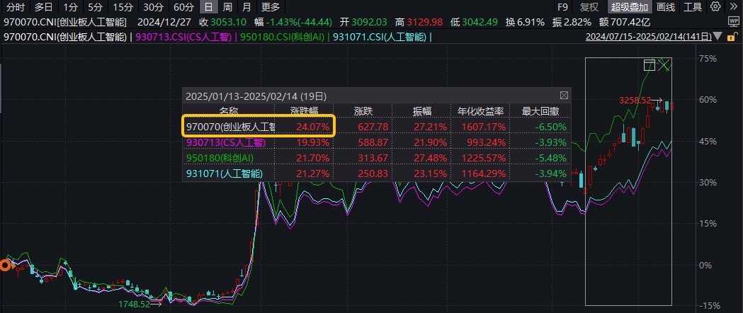 时间拉长看,春节以来国产大模型、数据软件、算力硬件等多重AI赛道分支均迎利好,AI赛道投资热情高涨。本轮AI主题行情已由低点完成“V”型逆转,创业板人工智能指数领衔同类指数反攻。 数据显示,截至2月14日,创业板人工智能指数自本轮低点(1月13日)以来累计反弹超24%,优于同期人工智能、CS人工智、科创AI等多只AI主题指数,表明创业板人工智能指数在反攻行情中更具弹性优势。